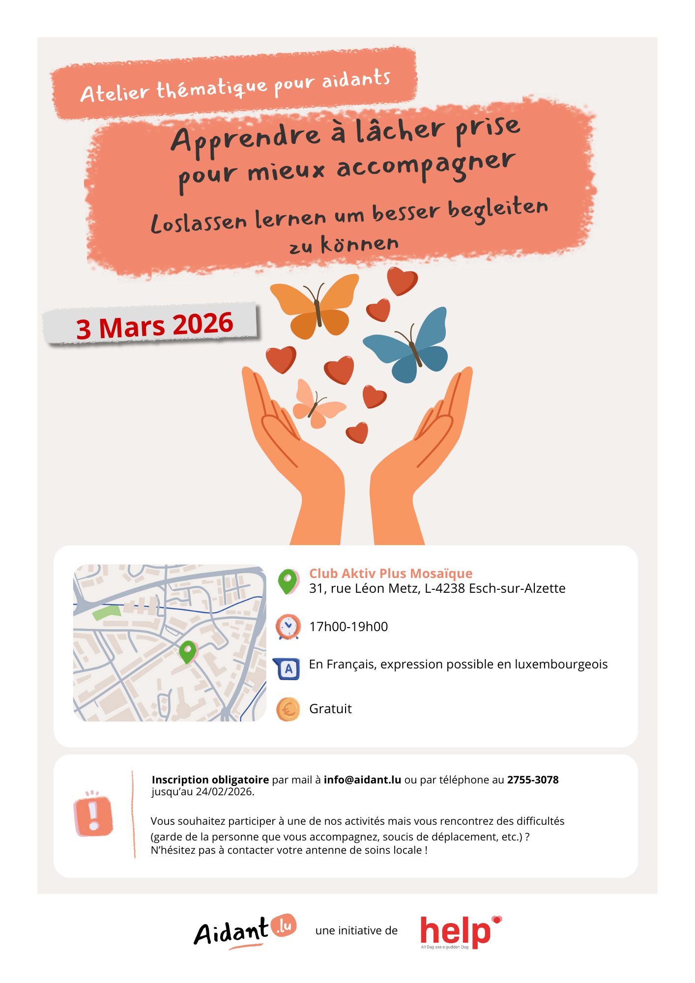 Anmeldung: erforderlich per E-Mail an info@aidant.lu, telefonisch unter 2755-3078 oder über unser Einschreibungsformular auf aidant.lu bis zum 24/02/2026.